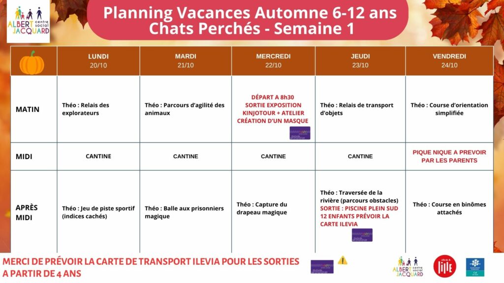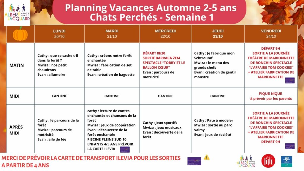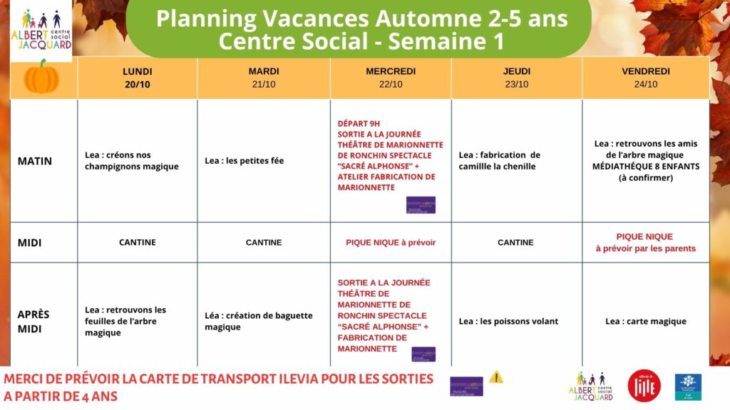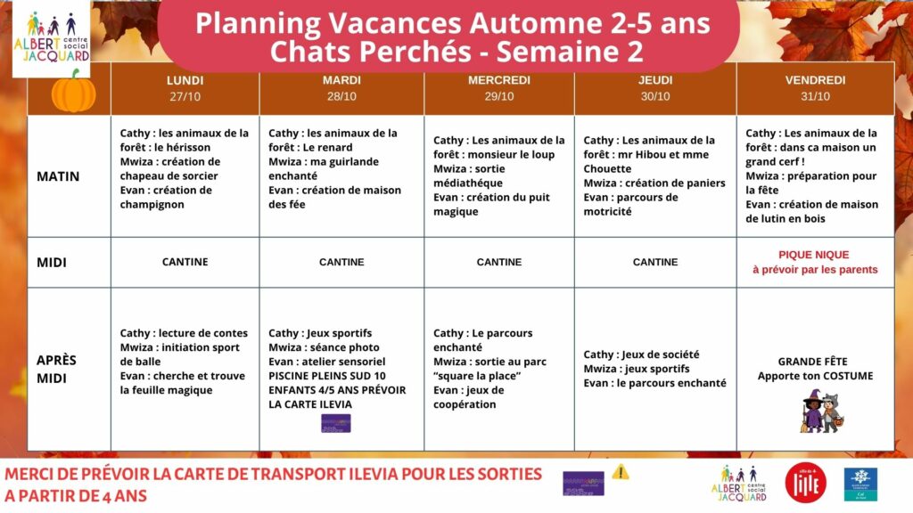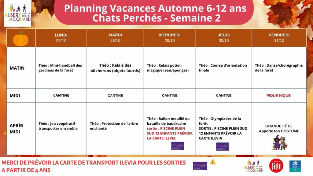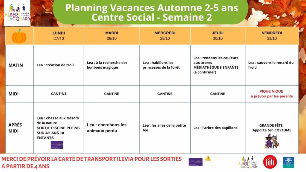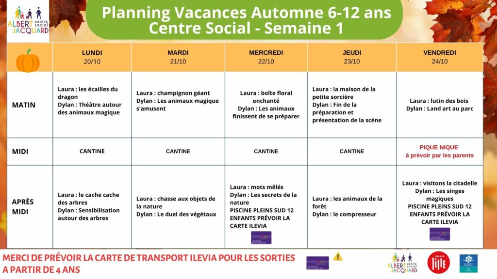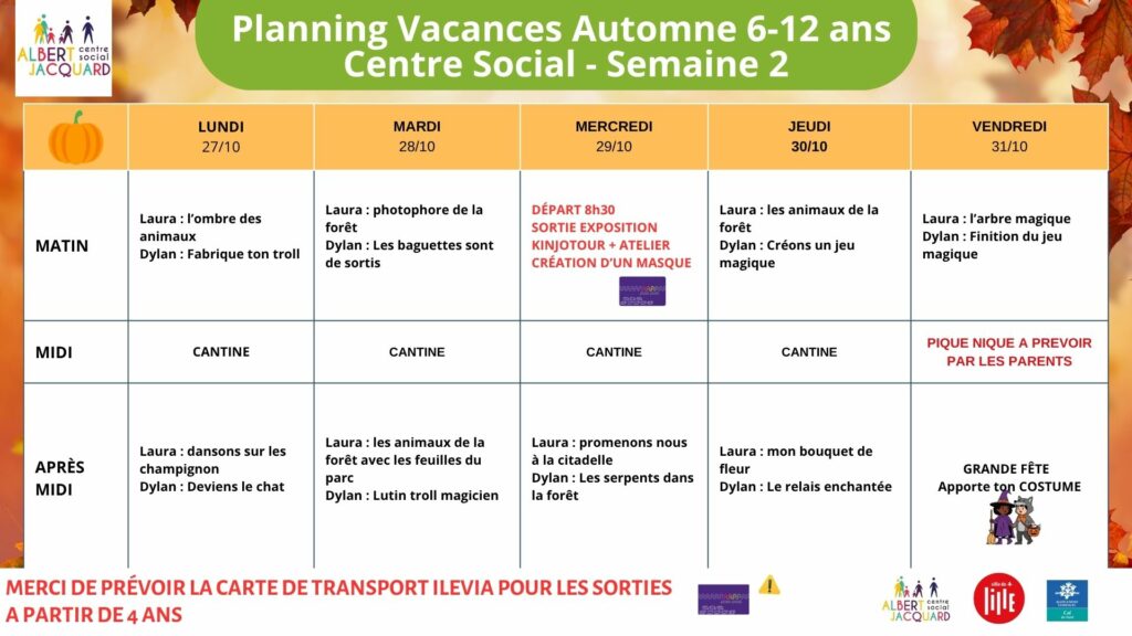 Merci de prévoir pour les enfants à partir de 4 ans : La Carte transport Ilévia pour les jours de sortie.
